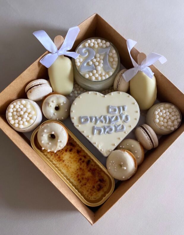 צנצנת מוס , מוס לב זוגי , 2 מגנומים , 2 קינוחי כוסות אישיים , 4 דונאטס , 3 מקרונים , קרם ברולה זוגי