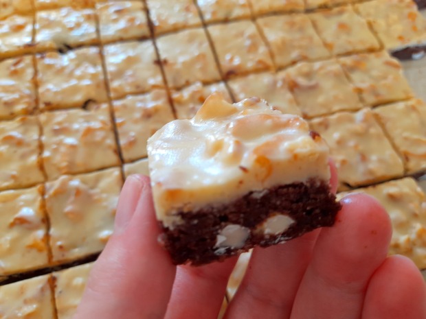 שכבת בראוניז פאדג' ומעל שכבת קרמל בייגלה מלוח. שילוב טעמים משגע. כמובן הכל ללא גלוטן!