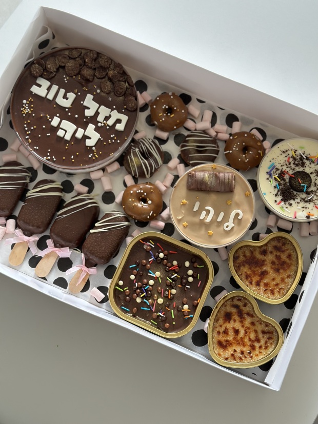 2 קרם ברולה, 2 קינוחי מוס קטנים מעוצבים, עוגת שוקולד נימוחה, 4 מגנומים עבודת יד, ו5 דונאטס אפויים מצופים