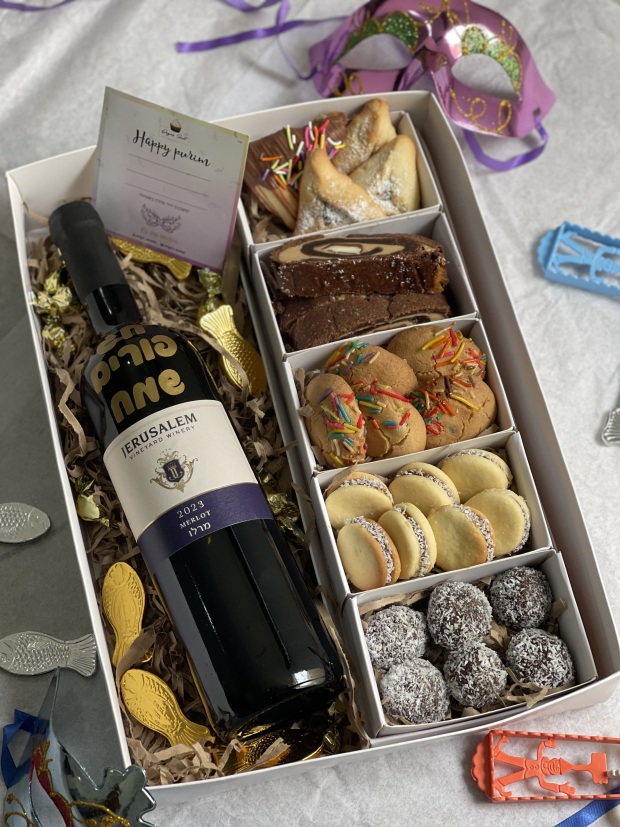 המארז כולל בקבוק יין עם כיתוב חג פורים שמח