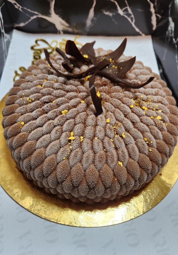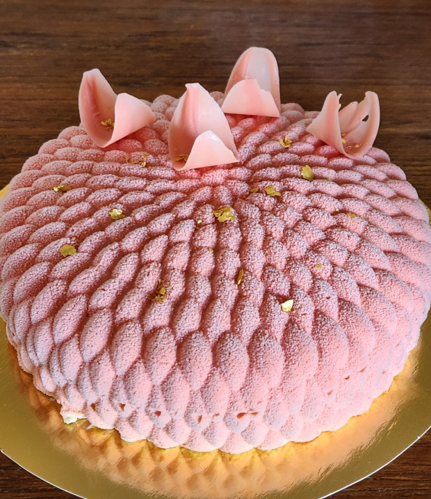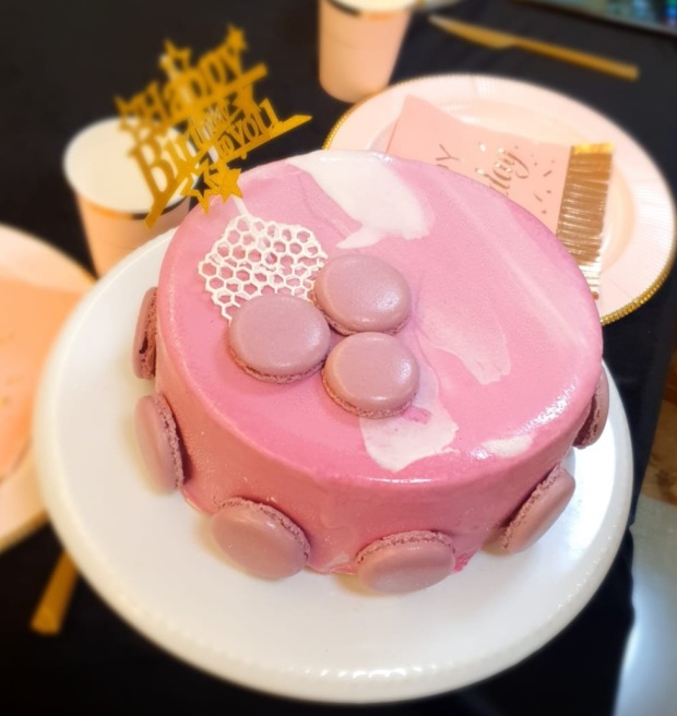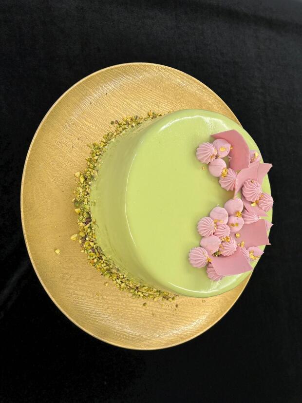 ספונז' פיסטוק, קראנץ' פיסטוק, מוס פיסטוק, ג'לי פירות יער, מוס פירות יער בציפוי גלסאז' ירוק וזילוף שוק'