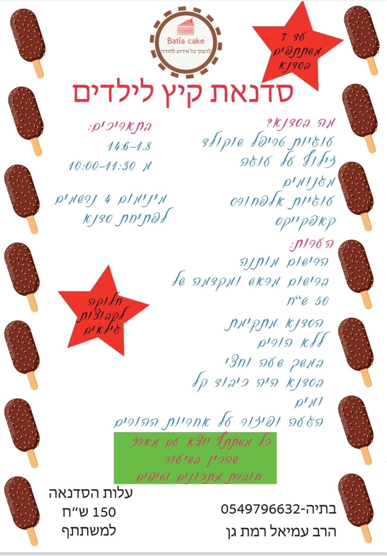 תהיה אפשרות לפתוח סדנא רק אם היה רישום של 4 ילדים במידה והיה ביקוש לתאריכים אחרים ולסדנאות בצוהרים הפתח סדנאות לתאריכים האלה ולאחר הצהריים