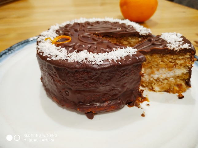 עוגת שכבות תפוזים , קרם קוקוס וציפוי נוטף שוקולד מריר